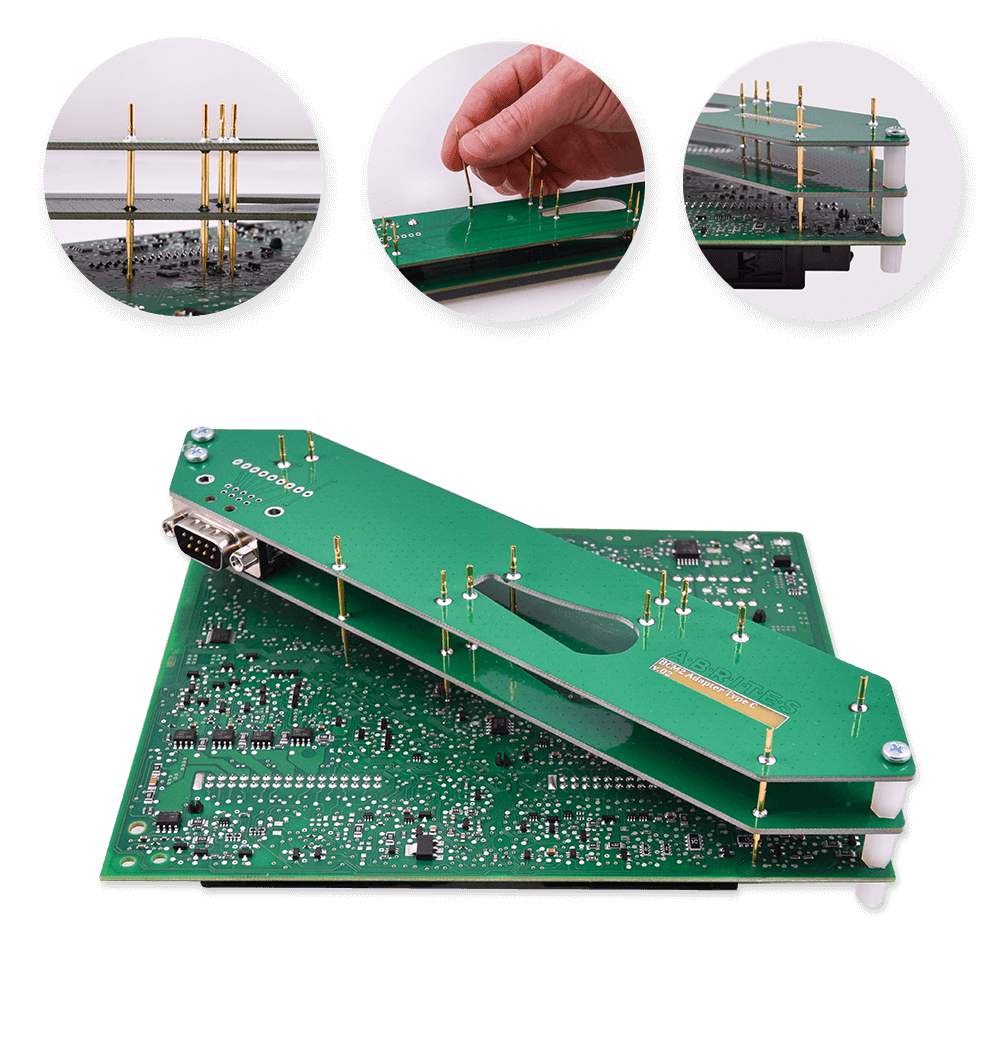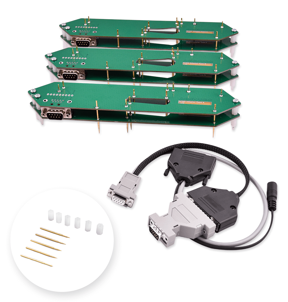 - 3 removable BCM2 adapter boards equipped with expertly placed needles to fit various types of BCM2 modules:
